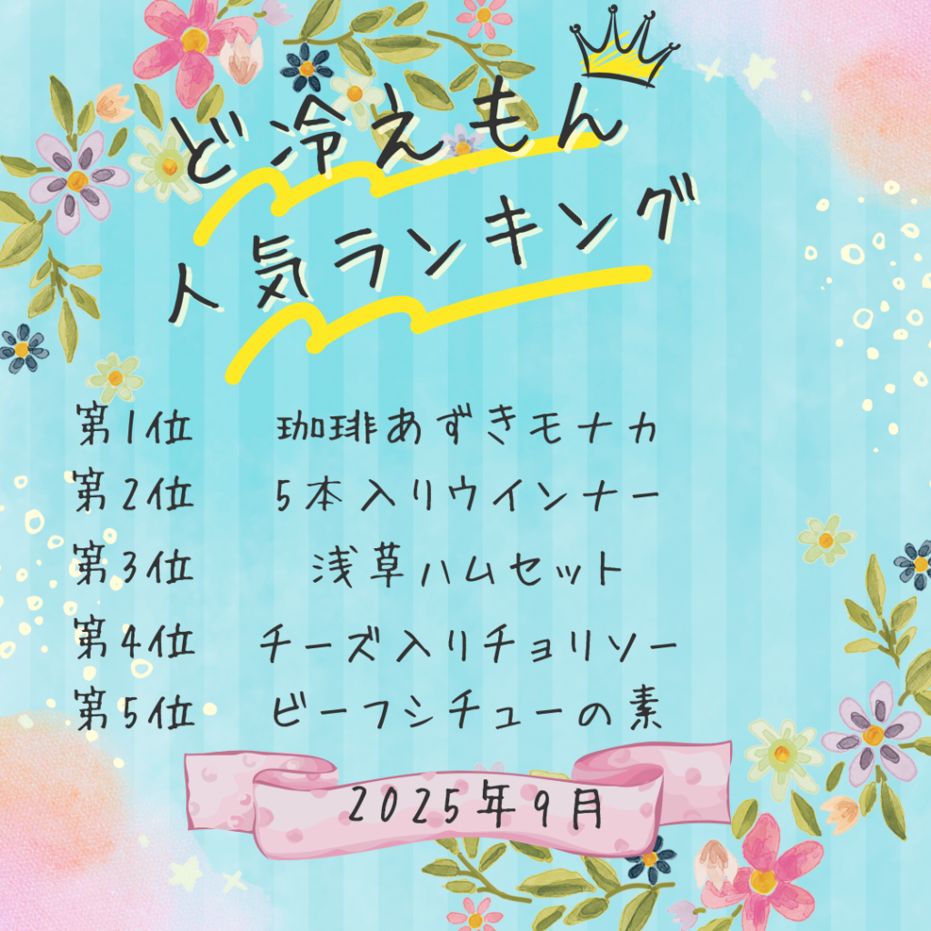 2025.10.06 2025年9月ど冷えもん☆人気ランキング☆ 9月の売れ行き好調商品のご紹介です!! 今回は酷暑が続いたこともあり、珈琲あずきモナカの売れ行きが好調でした!!後半は量目変更(80g⇒95gへ増量)の為、若干価格が上がりましたが、売れ行き好調です!!また、手軽に使える商品や浅草ハムが誇る商品も多く売れておりました!!近々新商品も導入する予定ですので、皆様お楽しみに☆彡(^^♪