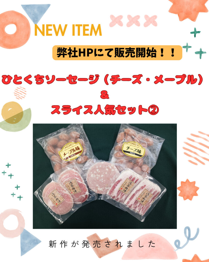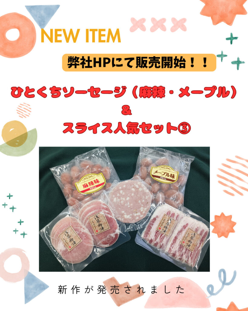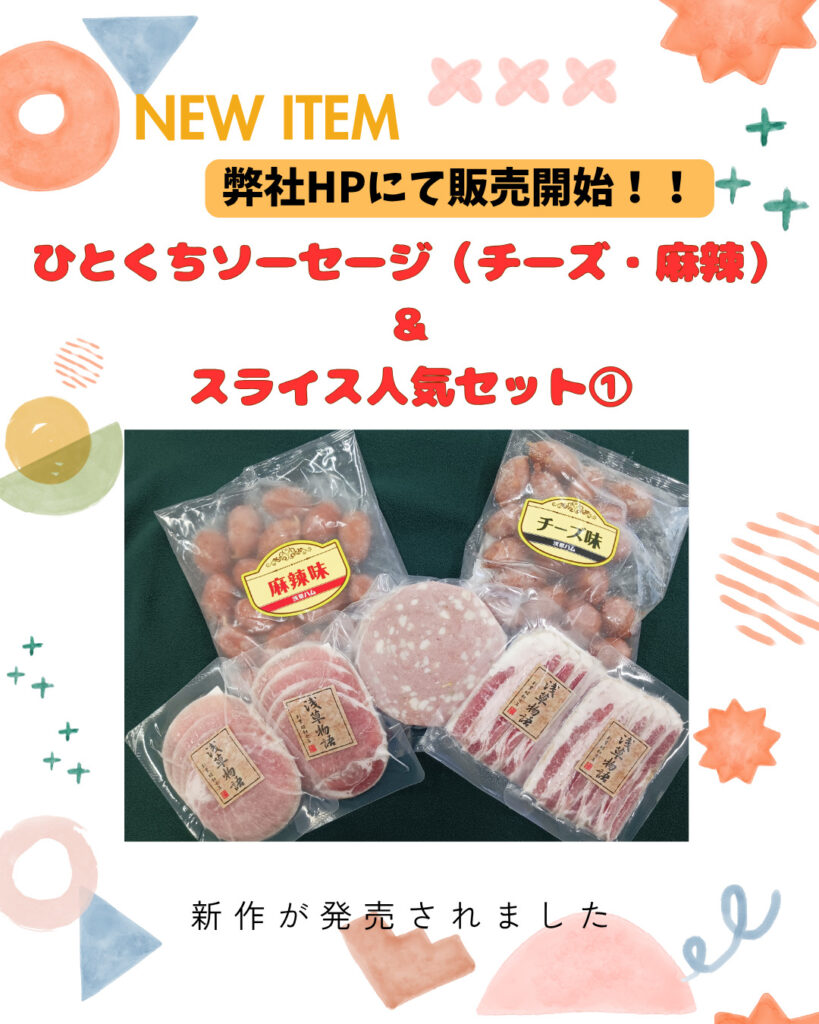 お知らせ 2025.10.23 新商品発売☆新セットにて購入可☆彡 ひとくちソーセージ(チーズ・麻辣)&スライス人気セット①(1.3kg大容量!!) ひとくちソーセージ(チーズ・メープル)&スライス人気セット②(1.3kg大容量!!) ひとくちソーセージ(麻辣・メープル)&スライス人気セット③(1.3kg大容量!!) HPの販売商品に新商品(まだ巷には出回っておりません!)が入った新セットを掲載いたしました!! 弊社で人気のスライス商品と組み合わせての販売となります(^^)/【スライス商品詳細:昔仕込み薄切り60g×2P、熟成ベーコン60g×2P、浅草モルタデラSP300(1mmスライス)×1P】です。ひとくちソーセージは数種類展開しておりますので、お好きなセットをチョイスしてください♪♪ぜひ新しい味にチャレンジしてみてください!!(^_-)-☆