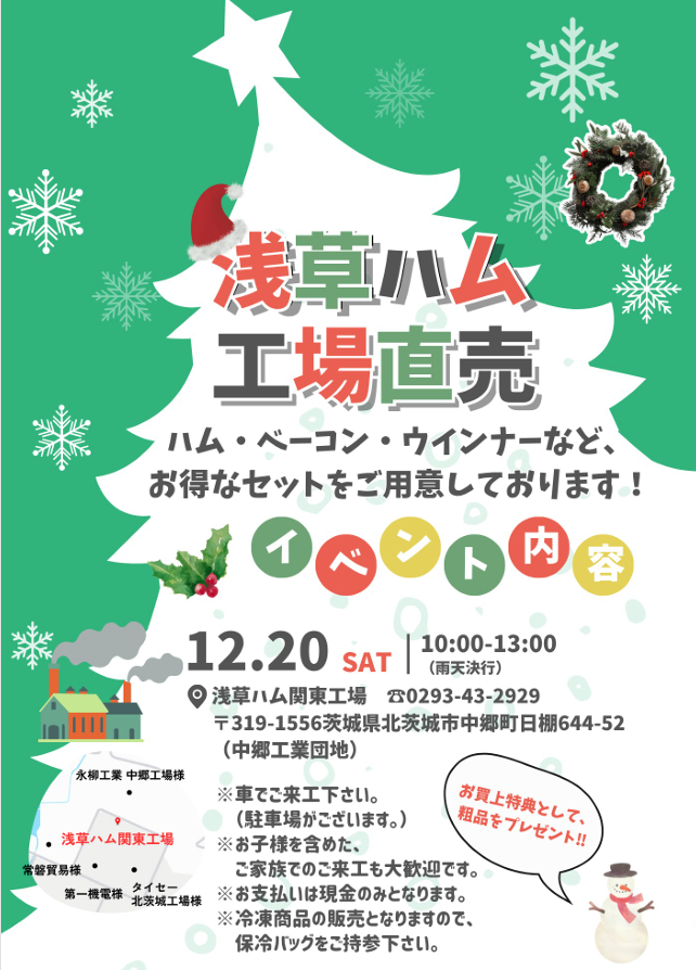 お知らせ 工場について 2025.12.15 ☆第2回!!工場直売会☆ 夏に開催された工場直売が好評につき、今週末に第2回工場直売会を行います!! 2025年12月20日(土)浅草ハム㈱関東工場(北茨城市)にて、第2回工場直売会を開催します!! 今回も北茨城市商工会様にご協力いただき、年末年始前に開催する運びとなりました。 愛テックファーム様とのコラボサンドイッチも4種類をご用意し販売します!! 数に限りがございますので、早めのご来工をおすすめします。