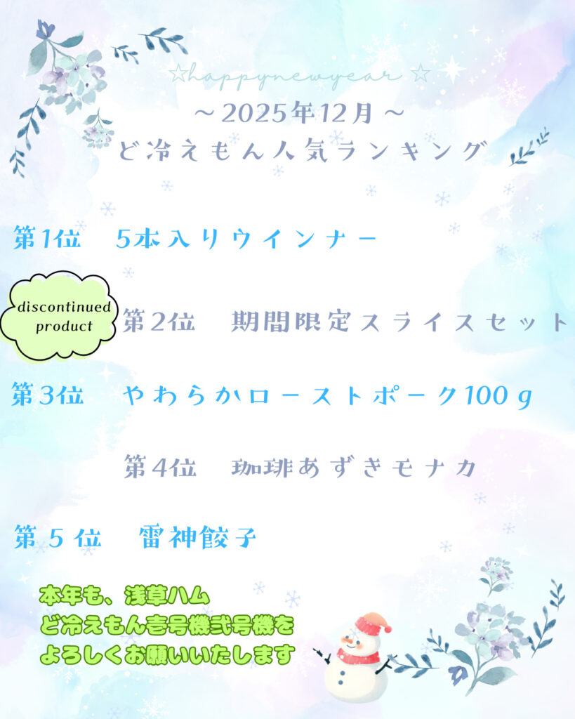 ど冷えもん☆ランキング 2026.01.06 2025年12月☆ど冷えもん人気ランキング☆ 新年あけましておめでとうございます。本年も弊社ど冷えもんに色々な商品を導入して参りますので、お近くにお立ち寄りの際はぜひご購入を♪♪(^^)/